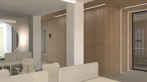 Nous avons créé un espace tout en douceur avec les codes des arches et l’utilisation du Terrazzo qui rappellent les bains romains, des murs arrondis en bois sculpté qui créent des parenthèses, des points de respiration pour se refaire une beauté, prendre son temps.